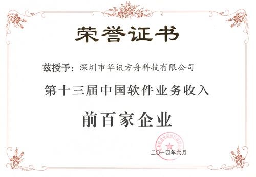 工業和信息化部運行監測協調局6月12日在青島市發布了2014年(第十三屆)中國軟件業務收入前百家企業(簡稱軟件百家)名單,華訊方舟集團入選2014年中國軟件收入百強,排名55位。