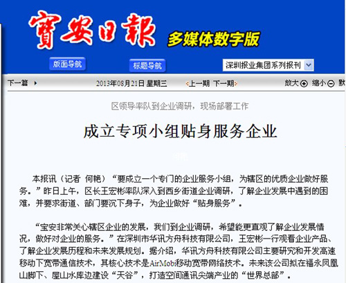 寶安區(qū)成立“華訊事務(wù)專項小組”,區(qū)長親任組長支持這家落戶寶安的先驅(qū)企業(yè)。該企業(yè)AirMobi技術(shù)解決了現(xiàn)在WIFI不能支持移動寬帶上網(wǎng),這一移動與帶寬沖突世界級技